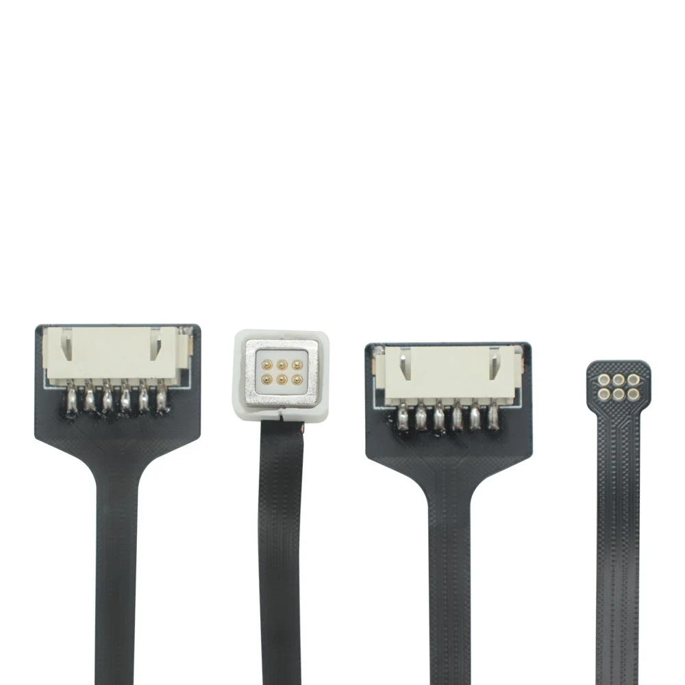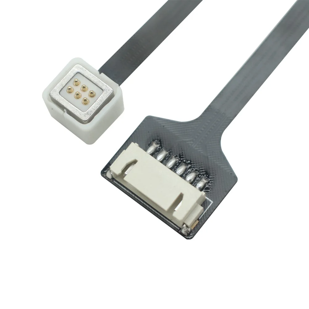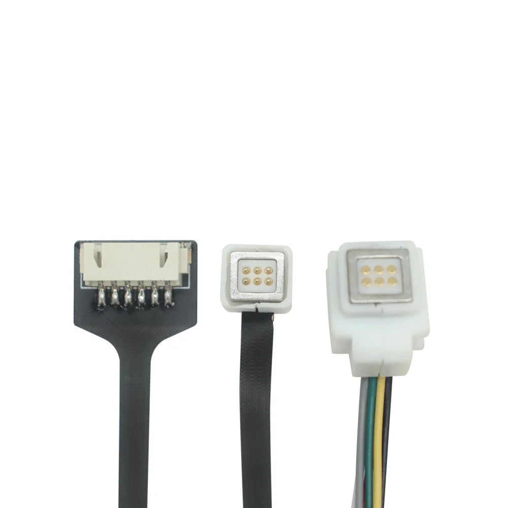 一侧集成了一个 磁性弹簧针 公连接器,为多个插拔周期提供稳定的弹簧加载触点,而另一侧则具有 6针XH2。54直角母连接器 用于 PCB 或模块连接。的 扁平电缆设计 最大限度地减少空间并增强灵活性,同时支持 信号和电力传输。